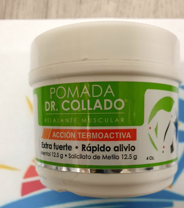 Descripción Pomada Dr Collado extra fuerte 7 onzas alivia los dolores musculares y las molestias causadas por: artritis, tendinitis, torceduras, moretones, calambres y rigidez. un calor Que relaja un mentol que funciona. (7oz)   Beschrijving...