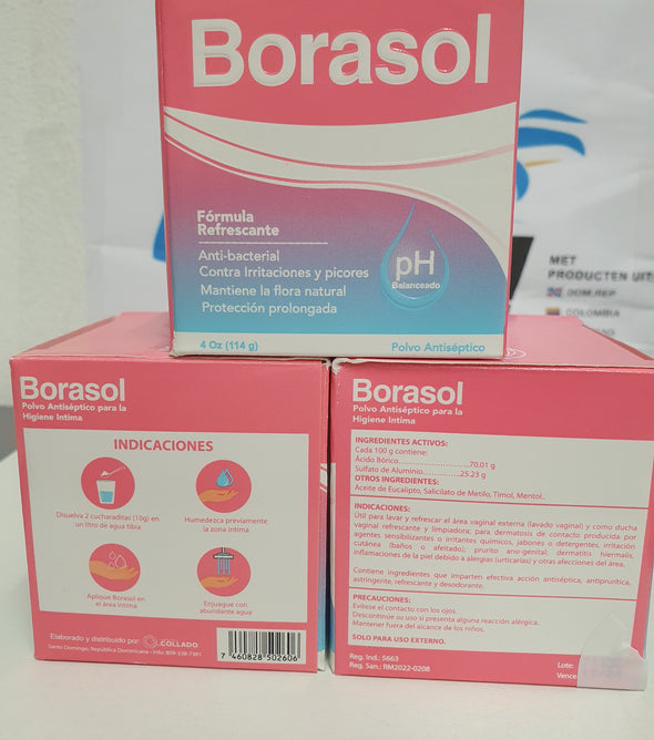 Descripción del Producto :Productomschrijving. Polvo antiséptico Borasol:Cuidado íntimo diario que te aporta una sensación de frescura y limpieza durante todo el día.Polvo antiséptico para la higiene íntima femenina. Antibacteriano, mantiene un pH equilibrado y una...