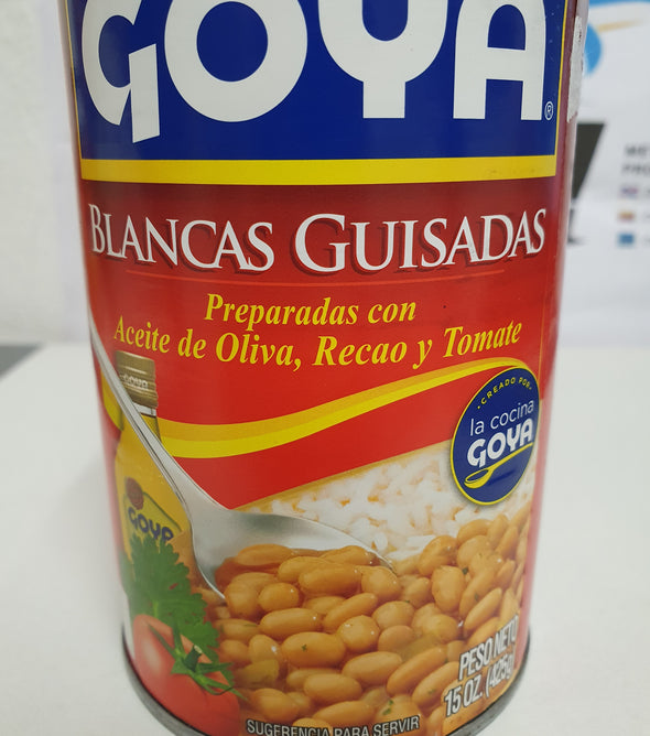 Habichuelas Blancas Guisadas. preparadas con Aceite de oliva, Recao y Tomate bajo la marca de productos Goya Gestoofde witte bonen. bereid met olijfolie, recao(Koriander) en tomaat onder het productmerk Goya