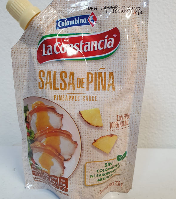 Descripción de  Salsa de piña La Constancia.   Marca: Colombina.   Peso: 200g.   Ingredientes: Azúcar, pulpa de piña (35%), agua, almidón modificado, gelificante (pectina), regulador de acidez (Ácido cítrico), espesante (Goma guar), conservante (Sorbato...